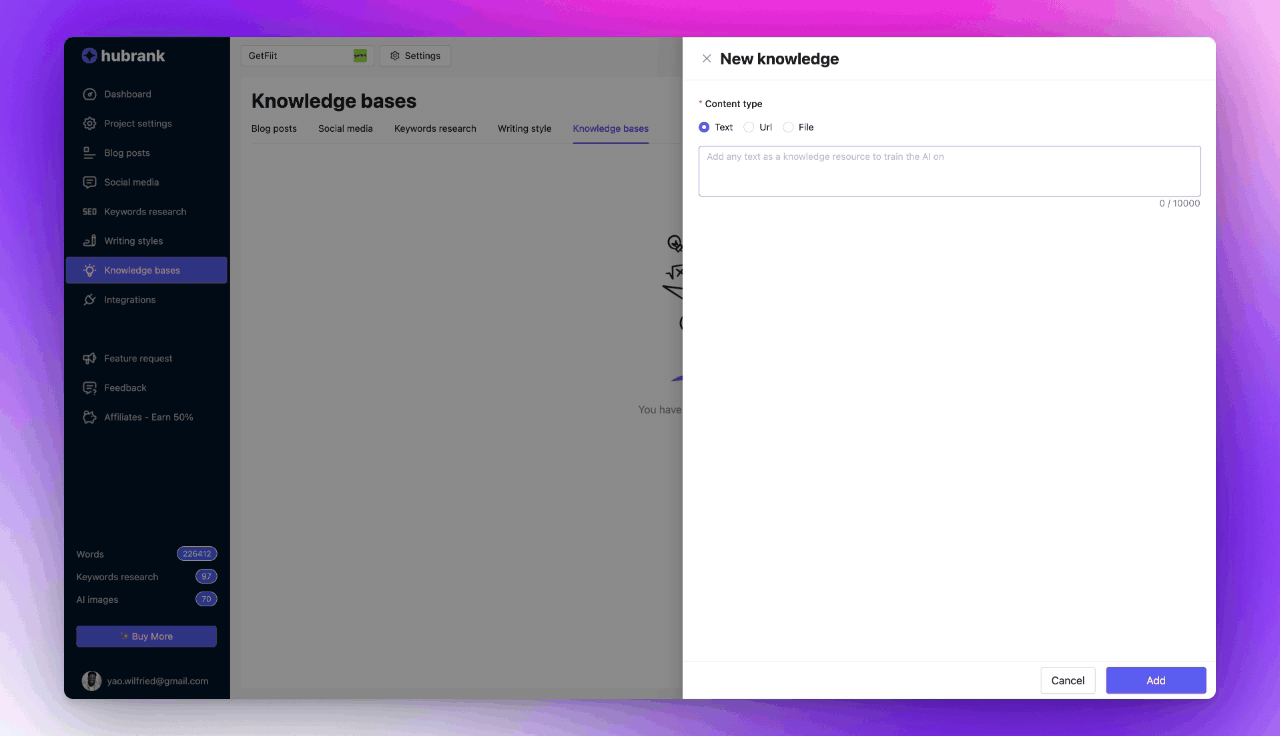 Upload your content (text, files, and URLs) to train Propel Studio's AI on your business, ensuring articles that capture your brand's unique identity and expertise.